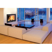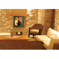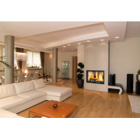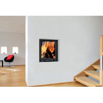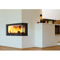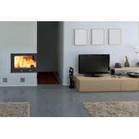 Monoblocco angolare in acciaio dotato di piedini regolabili, con focolare in ghisa, si può posizionare ad angolo o a parete. Portina in vetro ceramico resistente a 800°C con apertura a saliscendi e ad anta per la pulizia del vetro. Completo di kit ventilazione forzata da 800 m3/h.